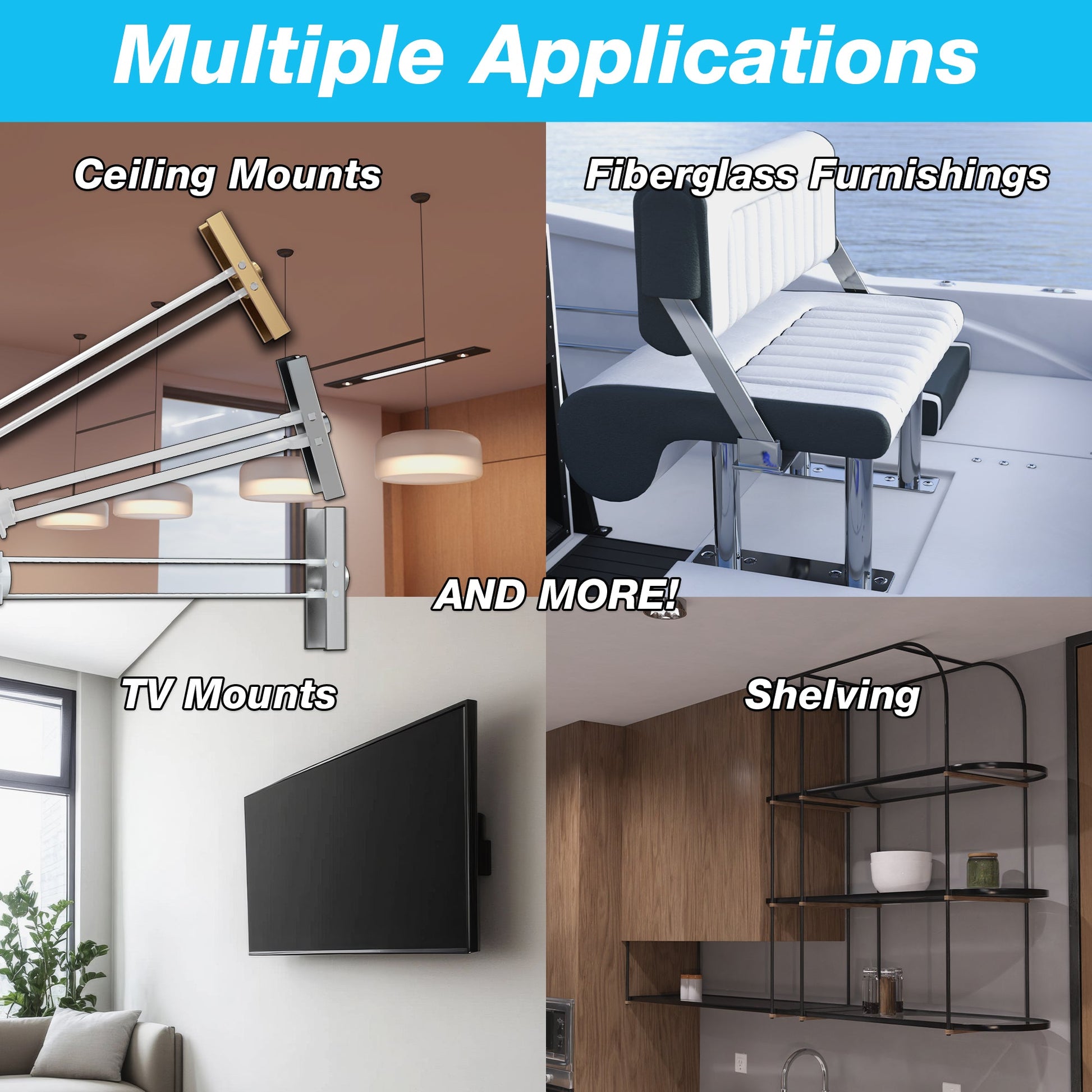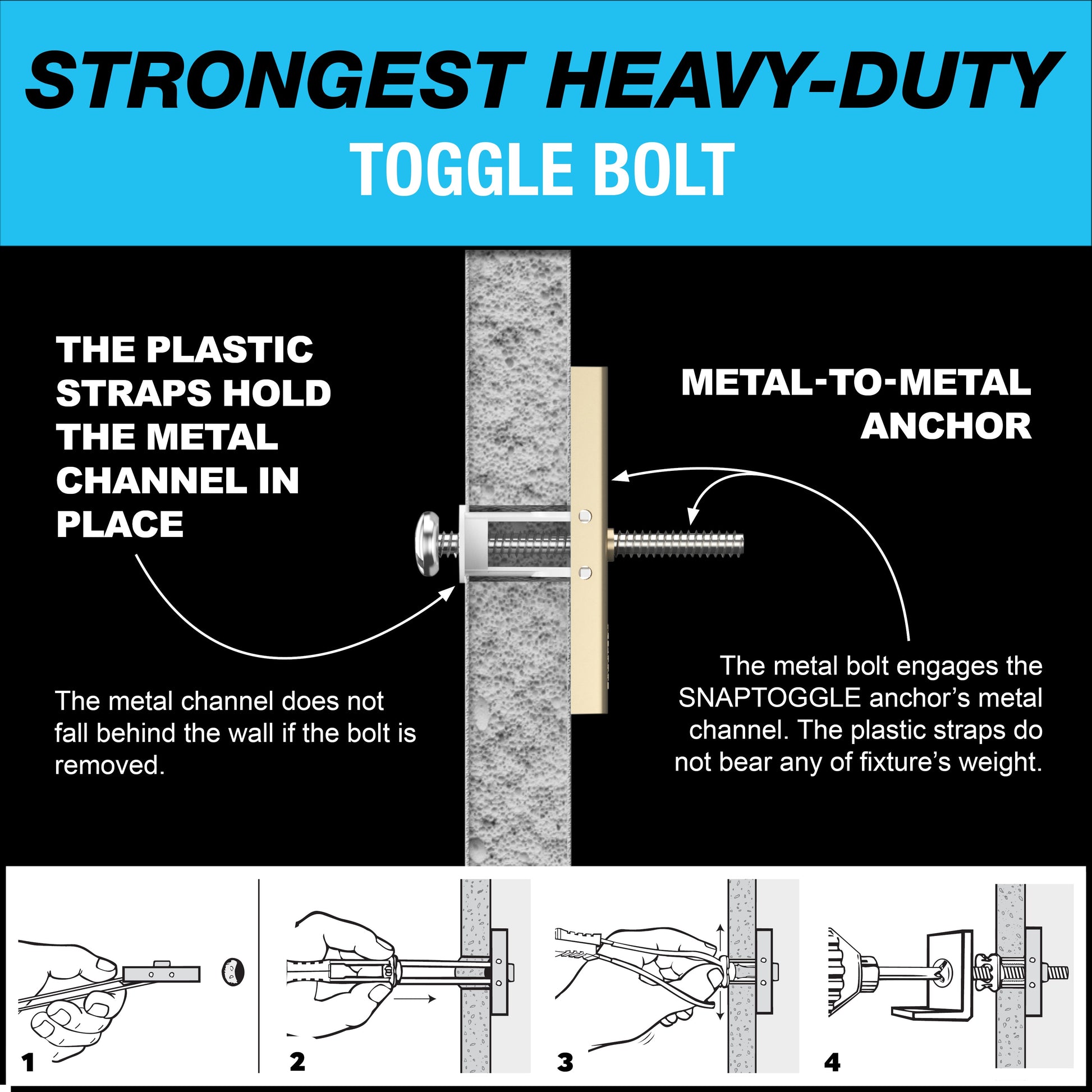 SNAPTOGGLE heavy-duty toggle bolts carry twice the load in a smaller hole than standard wing anchors. A patented strap design with sturdier straps and smaller ratchet interval adjusts more precisely and snaps off flush to the surface.